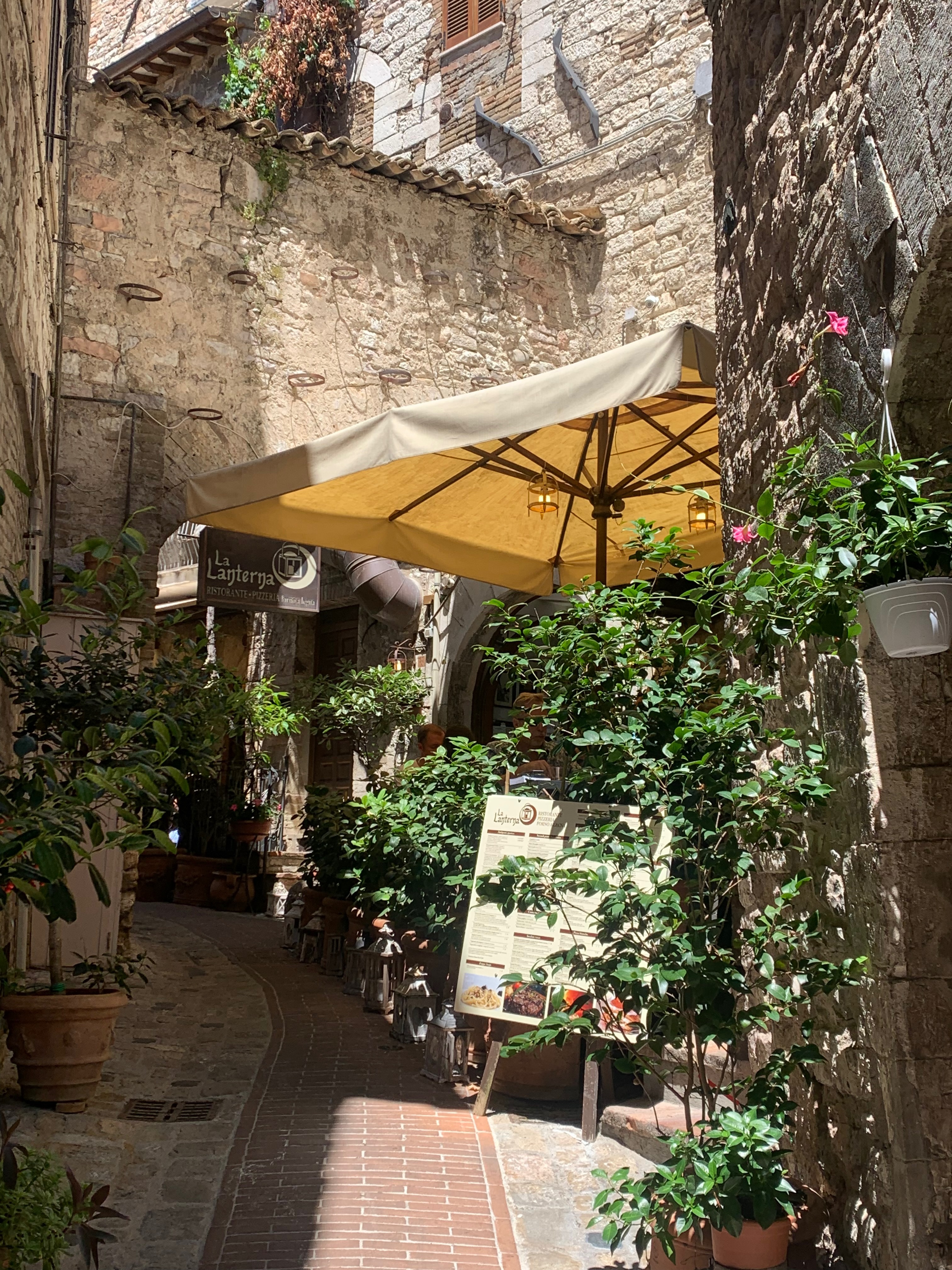 I wandered around without a plan. In a small side street I came across a café I recognized from a blog I’d read the night before: La Lanterna. I sat down, had a fantastic lunch, and stayed for a long while. I still hadn’t decided what else I wanted to see, so I did what I often do – I asked my trusted digital friend: ChatGPT. I typed, “Knowing me, what should I see in Assisi? Two or three places?”